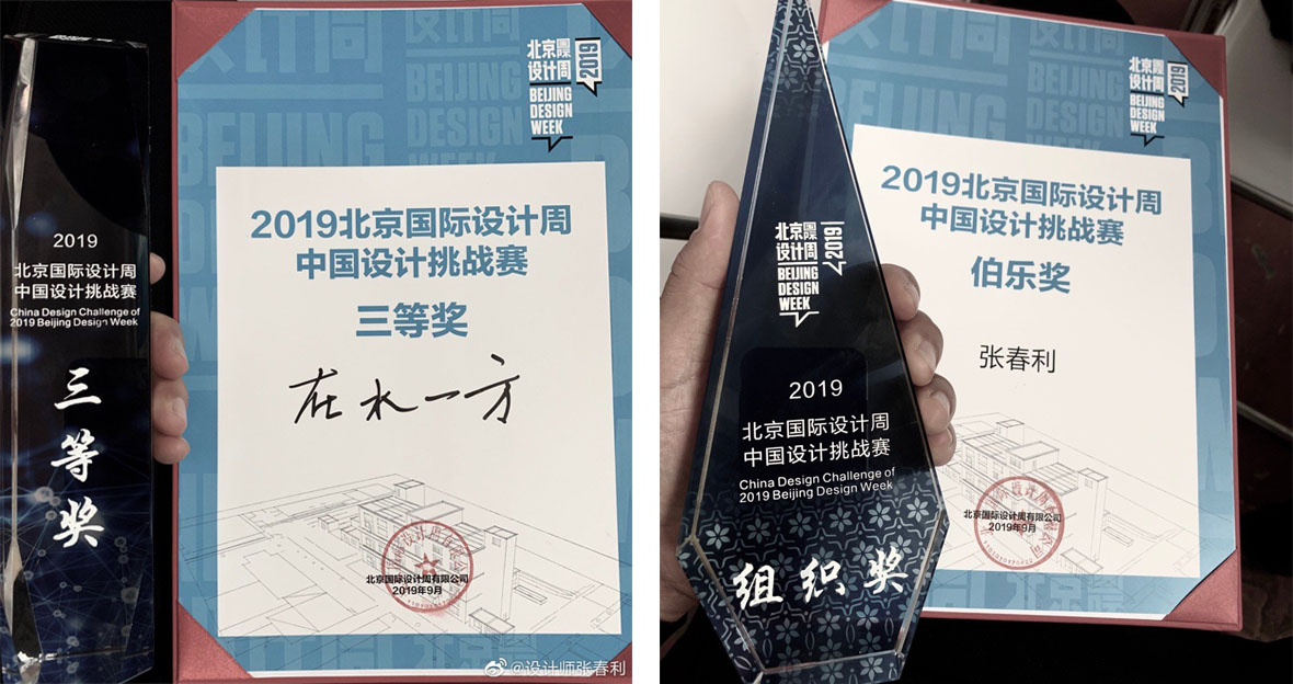 近日由张春利先生带队中央美术学院城市设计学院学生参与2019北京国际设计周中国设计挑战赛,学生组织创作“在水一方”作品获得三等奖,同时授予张春利先生“组织奖、伯乐奖”双项荣誉奖项。